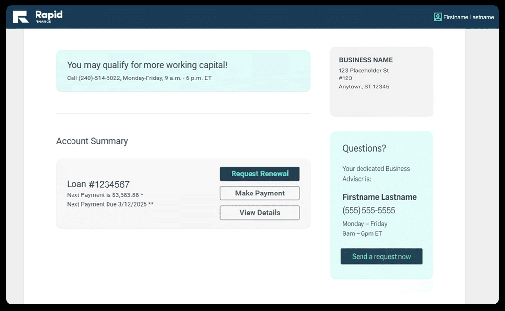 Once a client, you can request additional financing directly through your online account if eligible. Our goal is to make it easy for your business grow.